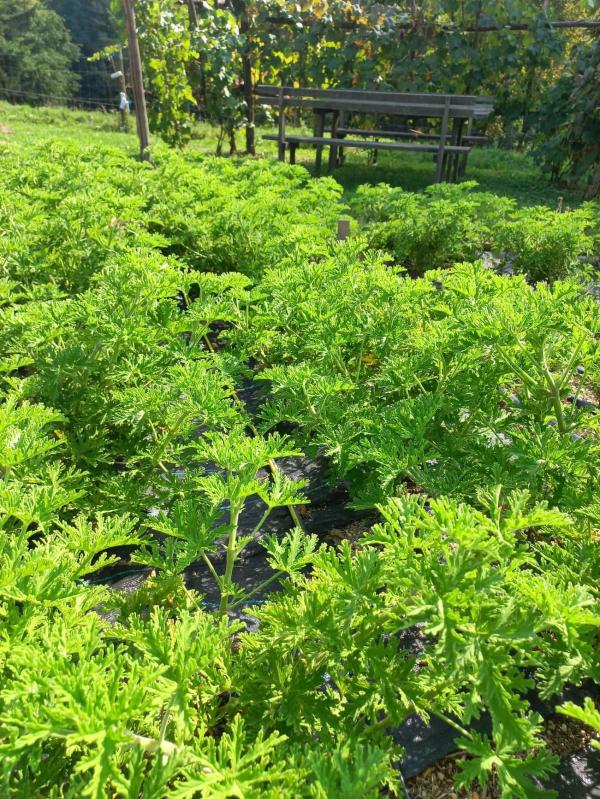 Opis: Pelargonije predstavljajo velik rod trajnic, ki so zelo priljubljene kot okrasno balkonsko cvetje. Dišeča pelargonija zraste kot grmiček do 1m višine. Listi so dlanasto deljeni, globoko vrezani, dlakavi in zelo aromatični. Somerni cvetovi so drobni in svetlovijoličaste barve. Rastlina izhaja iz Južne Afrike, danes pa je razširjena po vsem svetu. Med pelargonije danes prištevamo več kot 250 vrst ter na stotine križancev in sort, ki dajejo vse mogoče arome.